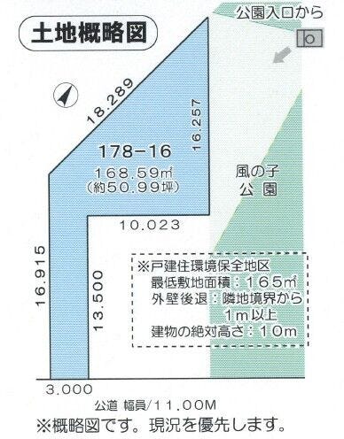 | 土地面積 | 公168.59㎡(50.99坪) | 接道 | 南東側(公道)幅 約11.0m 間口 約3.00m |