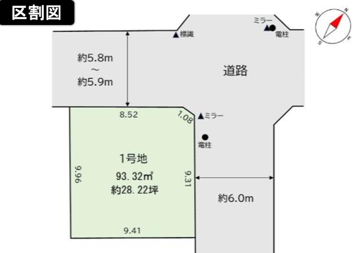 | 土地面積 | 公93.32㎡(28.22坪) | 接道 | 東側(公道)幅 約6.0m 北側(公道)幅 約5.8m |