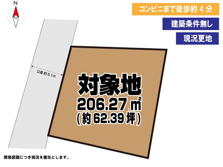 | 土地面積 | 公206.27㎡(62.39坪) | 接道 | 西側(公道)幅 約5.1m |