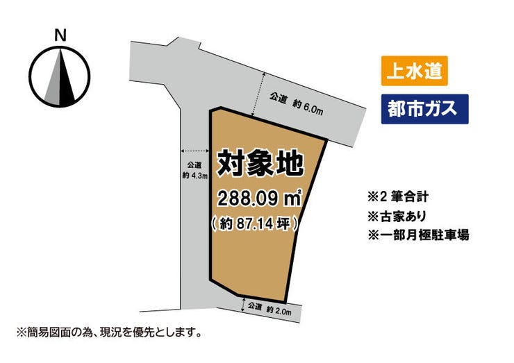 | 土地面積 | 公288.09㎡(87.14坪) | 接道 | 北側(公道)幅 約6.0m 間口 約14.50m 西側(公道)幅 約4.3m 間口 約24.00m 南側(公道)幅 約2.0m 間口 約10.00m |