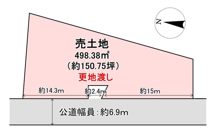 | 土地面積 | 公498.38㎡(150.75坪) | 接道 | 西側(公道)幅 約6.9m 間口 約16.85m |