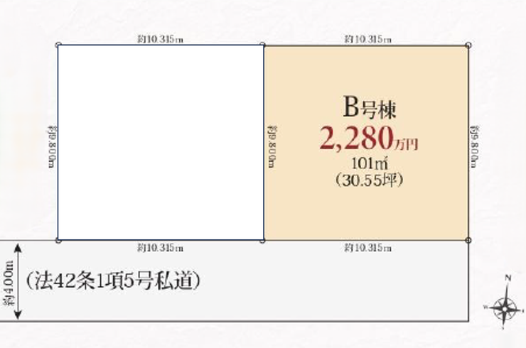 | 土地面積 | 実101㎡(30.55坪) | 接道 | 南側(私道)幅 約4.0m 間口 約10.31m |