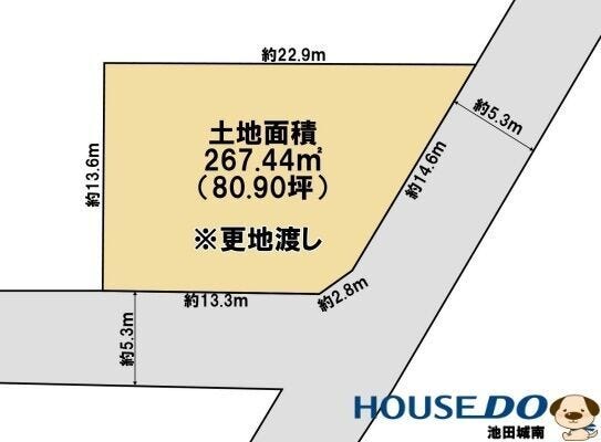 | 土地面積 | 公267.44㎡(80.90坪) | 接道 | 南側(公道)幅 約5.3m 間口 約13.30m 東側(公道)幅 約5.3m 間口 約14.60m |