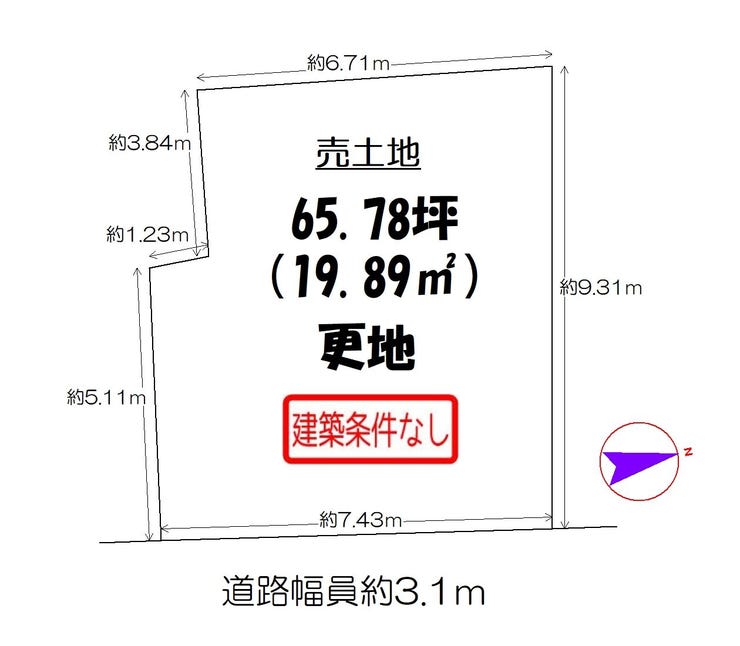 | 土地面積 | 公65.78㎡(19.89坪) | 接道 | 東側(私道)幅 約3.1m 間口 約7.43m |