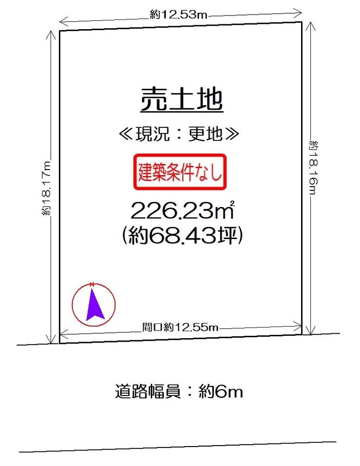 ★土地約68坪 ★前面道路幅員約6m ★間口約12.5m ★建築条件無し