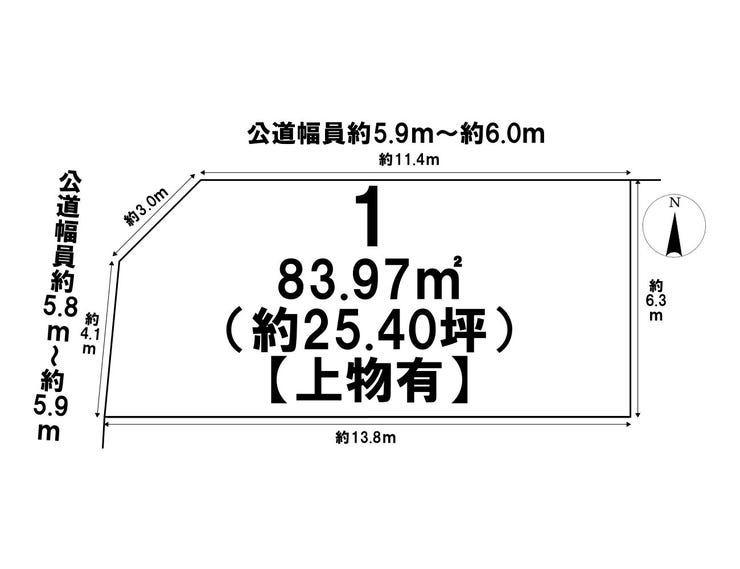 | 土地面積 | 実83.97㎡(25.40坪) | 接道 | 北側(公道)幅 約5.9m 間口 約11.43m 西側(公道)幅 約5.8m 間口 約4.19m |