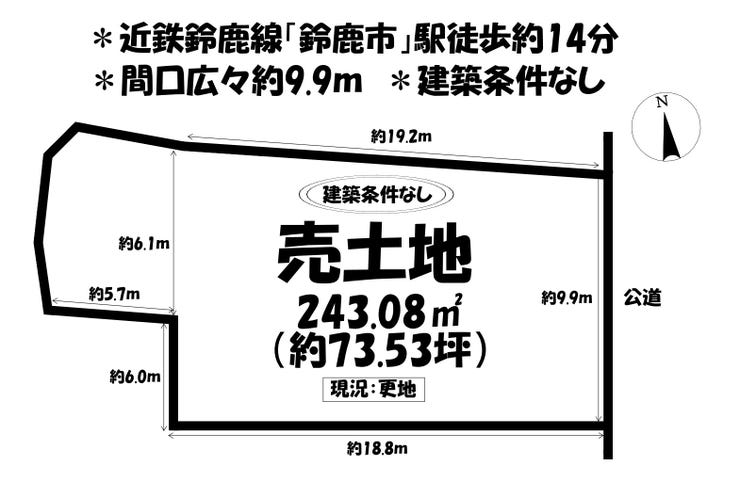 ■近鉄鈴鹿線「鈴鹿市」駅徒歩約14分■建築条件なし■現況更地■閑静な住宅街■間口広々約9.9m