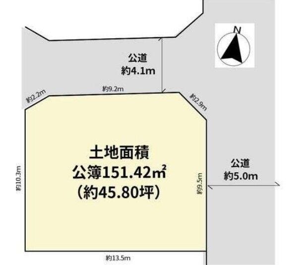 | 土地面積 | 公151.42㎡(45.80坪) | 接道 | 東側(公道)幅 約5.0m 間口 約9.50m 北側(公道)幅 約4.1m 間口 約9.20m |