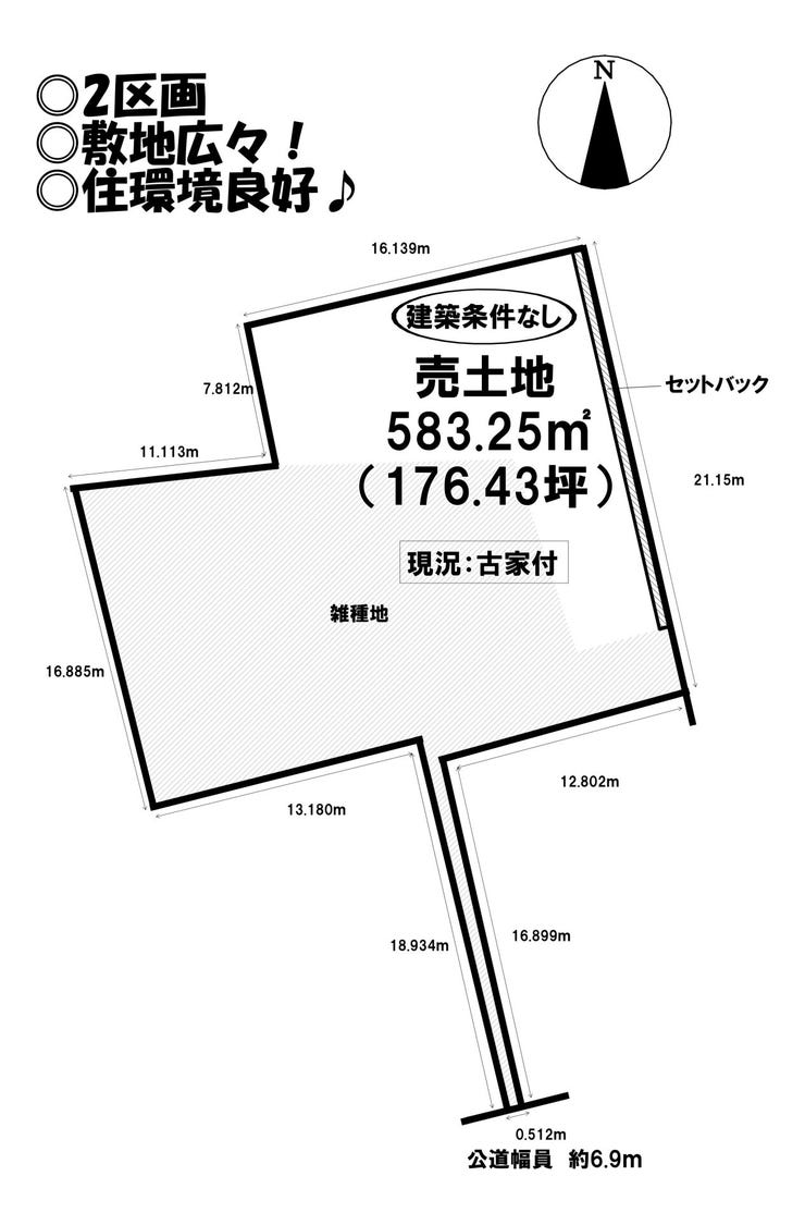 | 土地面積 | 公583.25㎡(176.43坪) | 接道 | 南側(公道)幅 約6.9m 間口 約0.51m 東側(公道)幅 約2.7m 間口 約24.15m |