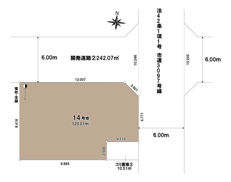 | 土地面積 | 実120.01㎡(36.30坪) | 接道 | 東側(公道)幅 約6.0m 北側(私道)幅 約6.0m |