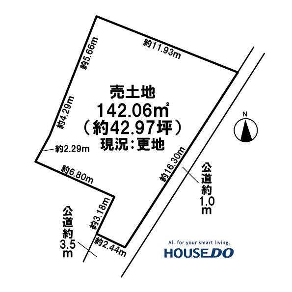 | 土地面積 | 公142.06㎡(42.97坪) | 接道 | 南西側(公道)幅 約3.5m 間口 約2.44m 南東側(公道)幅 約1.0m 間口 約16.30m |