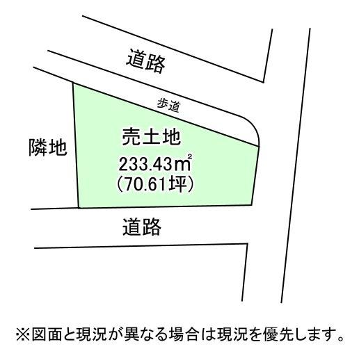 | 土地面積 | 公233.43㎡(70.61坪) | 接道 | 南側(公道)幅 約4.5m 間口 約19.90m 北側(公道)幅 約8.3m 間口 約22.60m |
