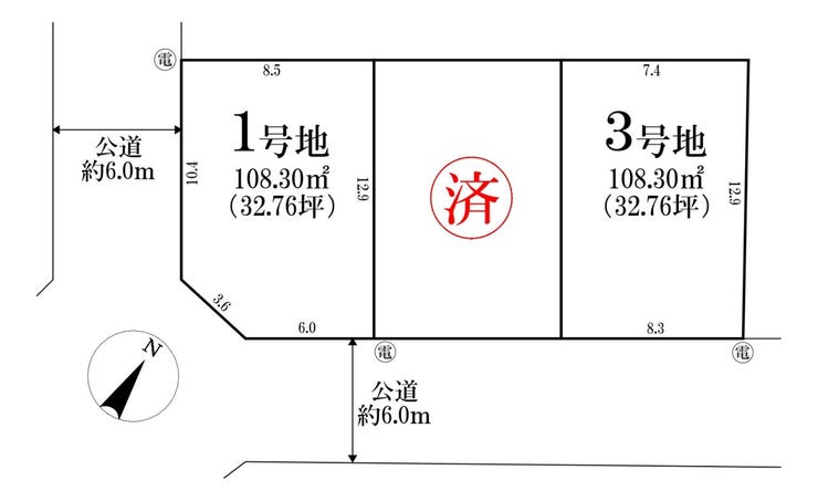 | 土地面積 | 実108.3㎡(32.76坪) | 接道 | 南東側(公道)幅 約6.0m 南西側(公道)幅 約6.0m |