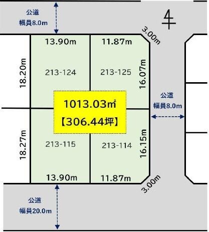 | 土地面積 | 公1013.03㎡(306.44坪) | 接道 | 南側(公道)幅 約8.0m 間口 約25.70m 東側(公道)幅 約8.0m 間口 約32.20m 北側(公道)幅 約8.0m 間口 約25.70m |