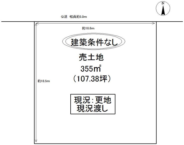 | 土地面積 | 公355㎡(107.38坪) | 接道 | 北側(公道)幅 約5.0m 間口 約18.50m |