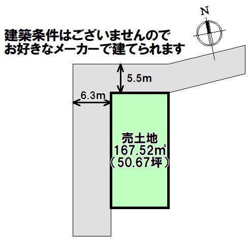 | 土地面積 | 167.52㎡(50.67坪) | 接道 | 北側(公道)幅 約5.5m 西側(公道)幅 約6.3m |