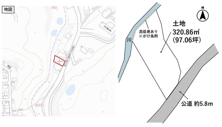 | 土地面積 | 公320.86㎡(97.06坪) | 接道 | 南東側(公道)幅 約5.8m 間口 約7.20m |