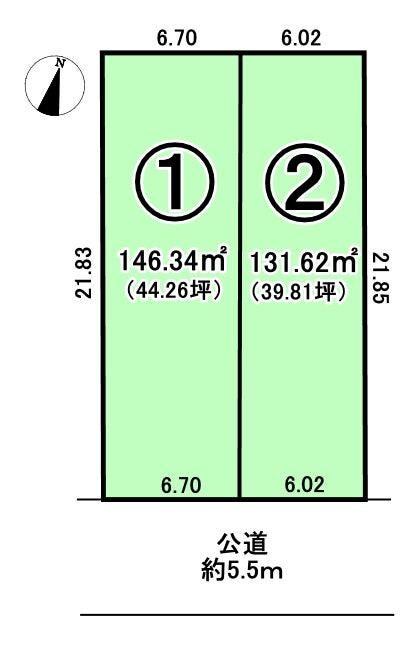 | 土地面積 | 公146.34㎡(44.26坪) | 接道 | 南側(公道)幅 約5.5m 間口 約6.70m |