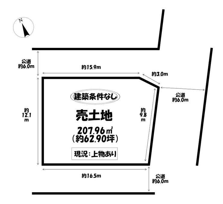 | 土地面積 | 公207.96㎡(62.90坪) | 接道 | 北側(公道)幅 約6.0m 間口 約15.90m 東側(公道)幅 約6.0m 間口 約12.80m 南側(公道)幅 約6.0m 間口 約16.50m |