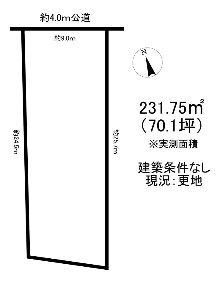 | 土地面積 | 実231.75㎡(70.10坪) | 接道 | 北側(公道)幅 約4.0m 間口 約9.00m |