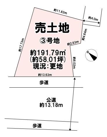 | 土地面積 | 実197.79㎡(59.83坪) | 接道 | 南西側(公道)幅 約13.1m 間口 約13.63m |