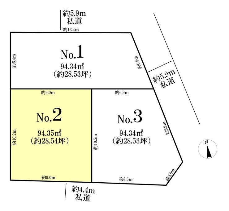 | 土地面積 | 実94.35㎡(28.54坪) | 接道 | 南側(私道)幅 約4.4m |