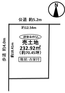 | 土地面積 | 公232.92㎡(70.45坪) | 接道 | 北側(公道)幅 約5.2m 間口 約12.54m 西側(公道)幅 約4.0m 間口 約18.41m |