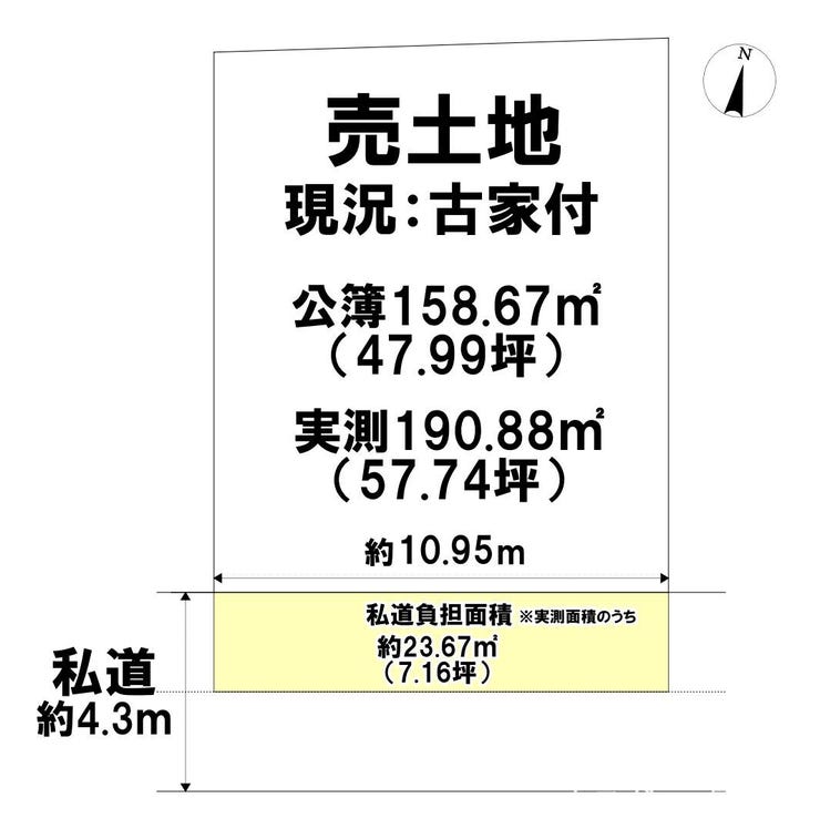 | 土地面積 | 公158.67㎡(47.99坪) | 接道 | 南側(私道)幅 約4.3m 間口 約10.95m |