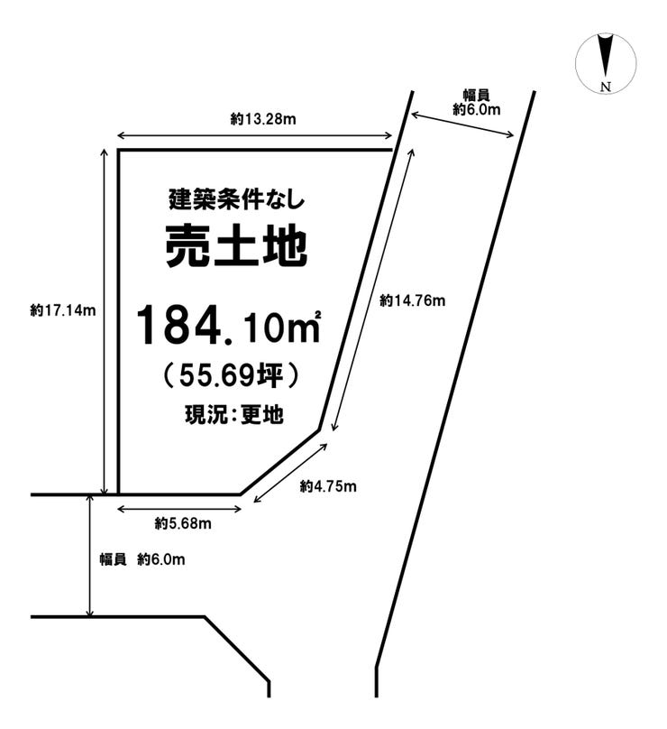 | 土地面積 | 公184.1㎡(55.69坪) | 接道 | 西側(公道)幅 約6.0m 間口 約14.76m 北側(公道)幅 約6.0m 間口 約5.68m |