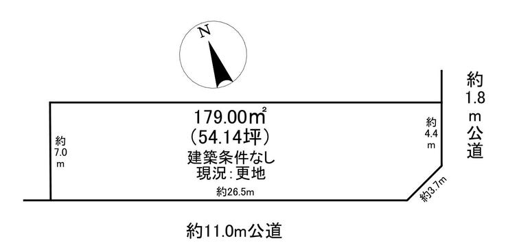 | 土地面積 | 公179㎡(54.14坪) | 接道 | 南側(公道)幅 約11.0m 間口 約26.50m 東側(公道)幅 約1.8m 間口 約4.40m |