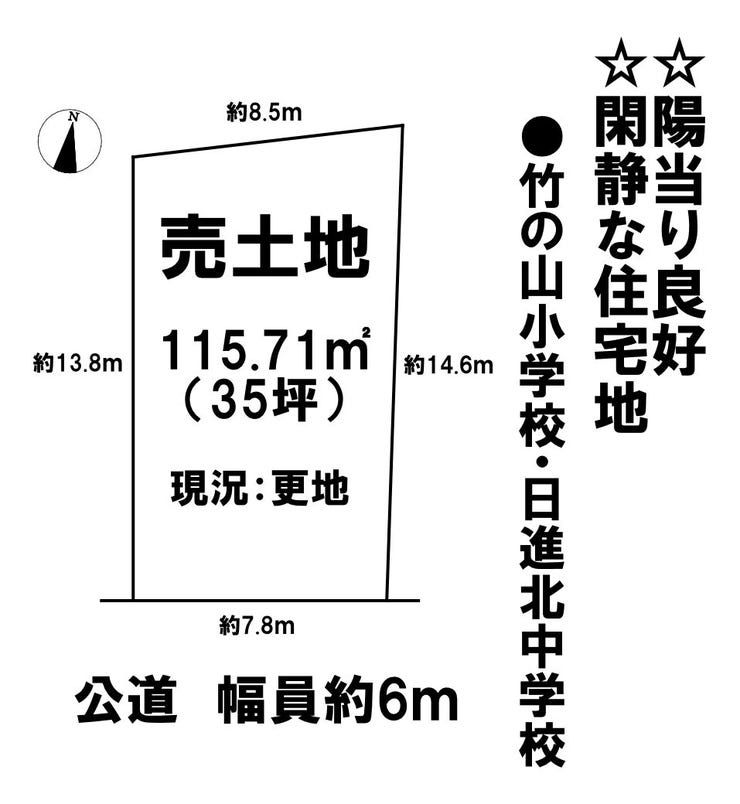 | 土地面積 | 実115.71㎡(35坪) | 接道 | 南側(公道)幅 約6.0m 間口 約7.80m |