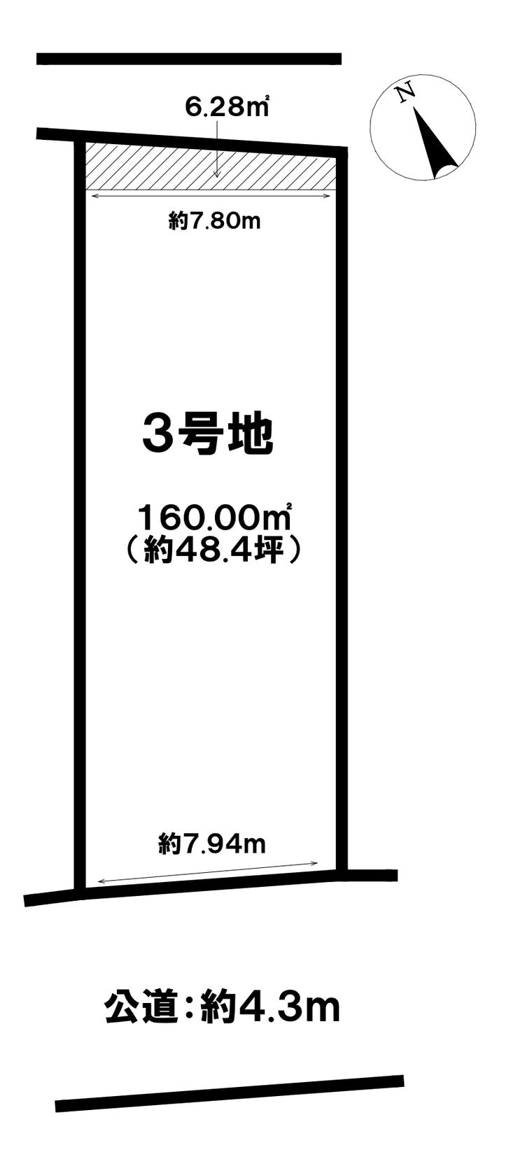 | 土地面積 | 公166.28㎡(50.29坪) | 接道 | 北側(公道)幅 約2.7m 間口 約7.80m 南側(公道)幅 約4.3m 間口 約7.94m |