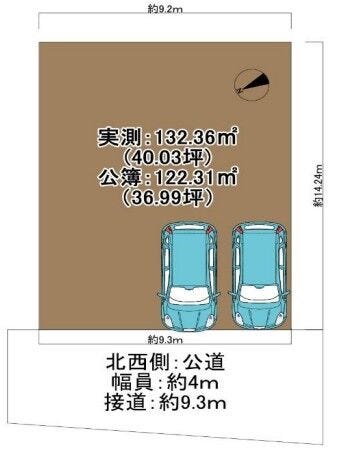 | 土地面積 | 実132.36㎡(40.03坪) | 接道 | 北西側(公道)幅 約4.0m 間口 約9.30m |