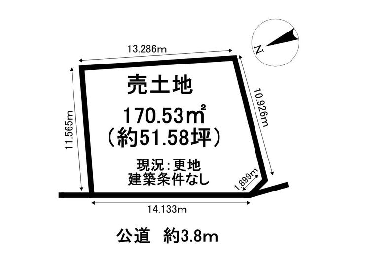 | 土地面積 | 170.53㎡(51.58坪) | 接道 | 西側(公道)幅 約3.8m 間口 約14.13m |