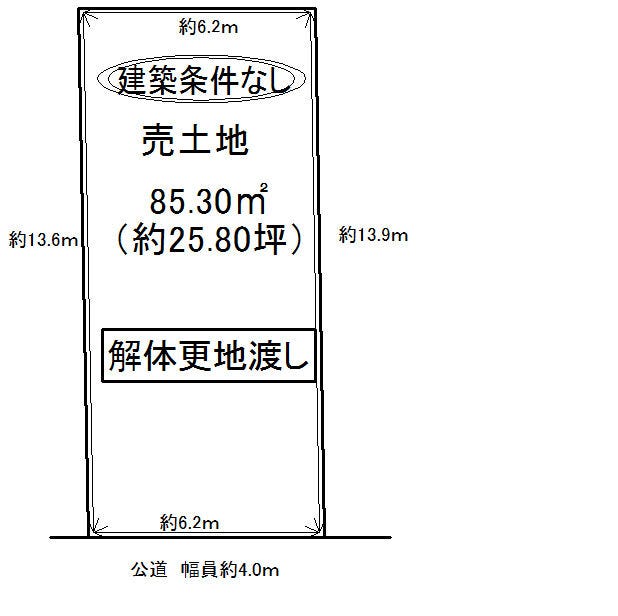 | 土地面積 | 公85.3㎡(25.80坪) | 接道 | 南西側(公道)幅 約4.0m 間口 約6.00m |
