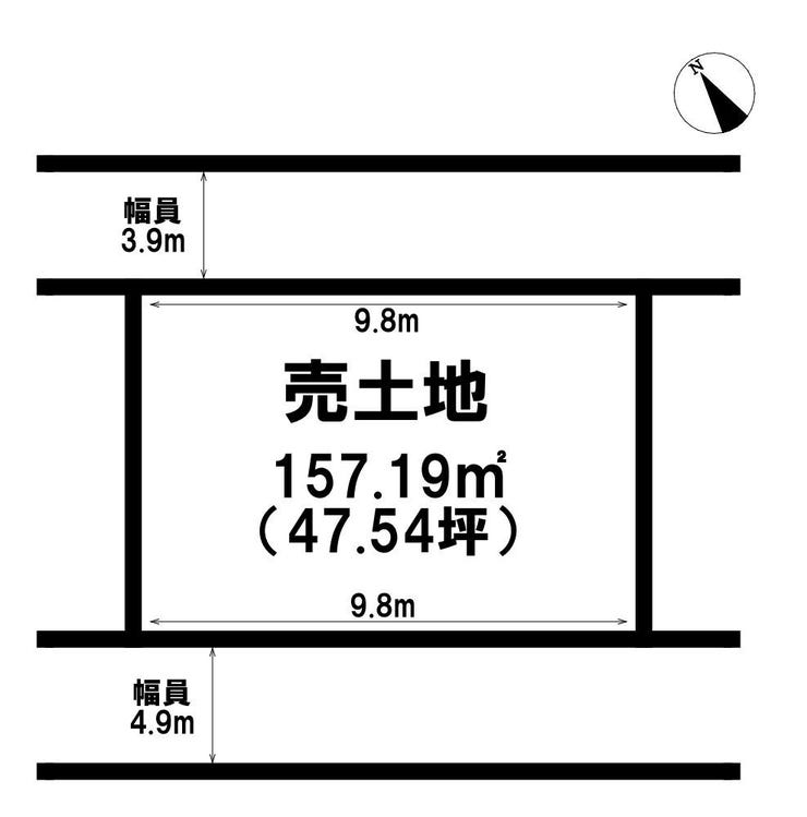 | 土地面積 | 公157.19㎡(47.54坪) | 接道 | 北側(公道)幅 約3.9m 間口 約9.80m 南側(公道)幅 約4.9m 間口 約9.80m |