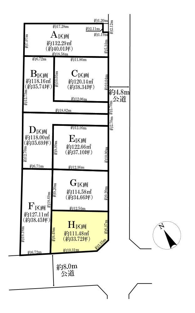 | 土地面積 | 実111.48㎡(33.72坪) | 接道 | 南西側(公道)幅 約8.0m 南東側(公道)幅 約4.8m |