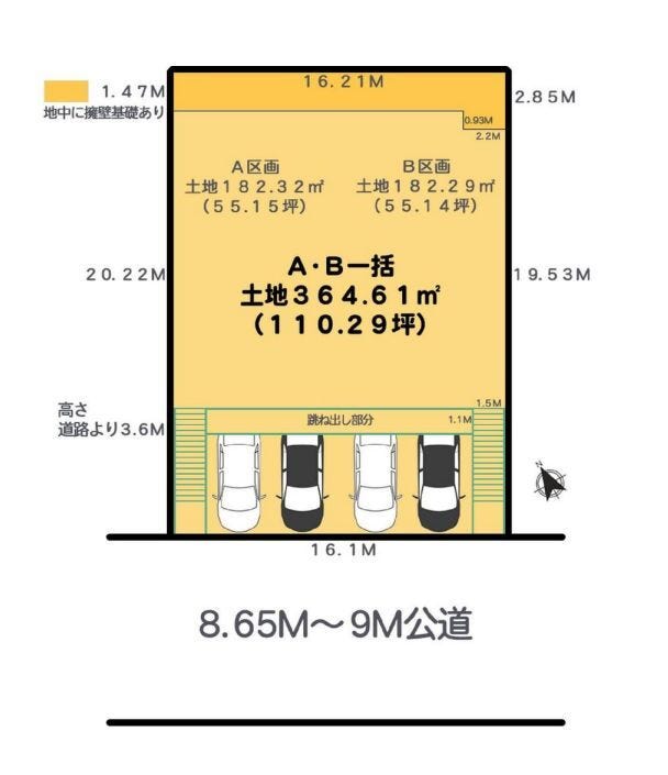 | 土地面積 | 実364.61㎡(110.29坪) | 接道 | 南側(公道)幅 約8.6m 間口 約16.10m |