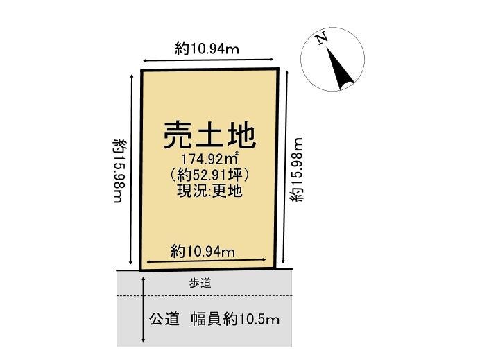| 土地面積 | 公174.92㎡(52.91坪) | 接道 | 南側(公道)幅 約10.5m 間口 約10.94m |