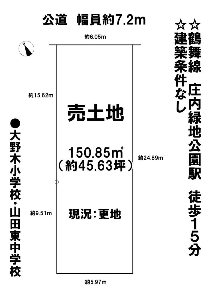 | 土地面積 | 公150.85㎡(45.63坪) | 接道 | 北側(公道)幅 約7.2m 間口 約6.05m |