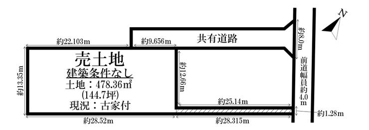 | 土地面積 | 公478.36㎡(144.70坪) | 接道 | 北西側(公道)幅 約4.0m 間口 約8.00m |