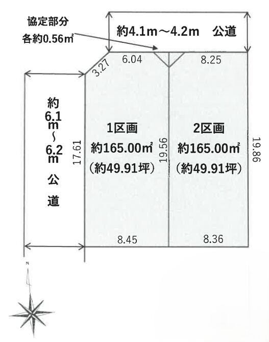 | 土地面積 | 165㎡(49.91坪) | 接道 | 北側(公道)幅 約4.1m 西側(公道)幅 約6.1m |