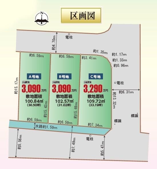 | 土地面積 | 100.84㎡(30.50坪) | 接道 | 北側(公道)幅 約4.7m 東側(公道)幅 約6.3m |