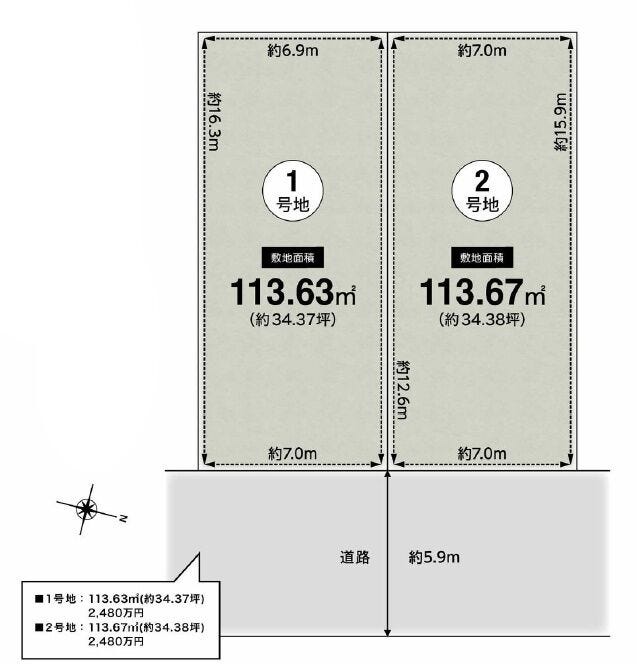 | 土地面積 | 113.63㎡(34.37坪) | 接道 | 東側(公道)幅 約5.9m 間口 約7.00m |