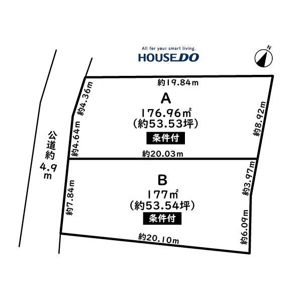 | 土地面積 | 公176.96㎡(53.53坪) | 接道 | 南西側(公道)幅 約4.9m 間口 約9.01m |