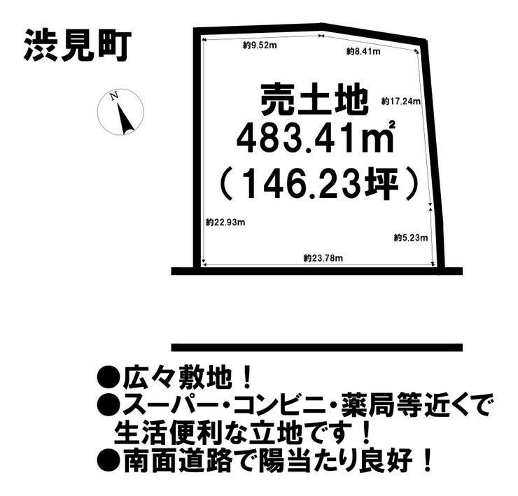 | 土地面積 | 公483.41㎡(146.23坪) | 接道 | 南西側(公道)幅 約16.0m 間口 約23.78m |