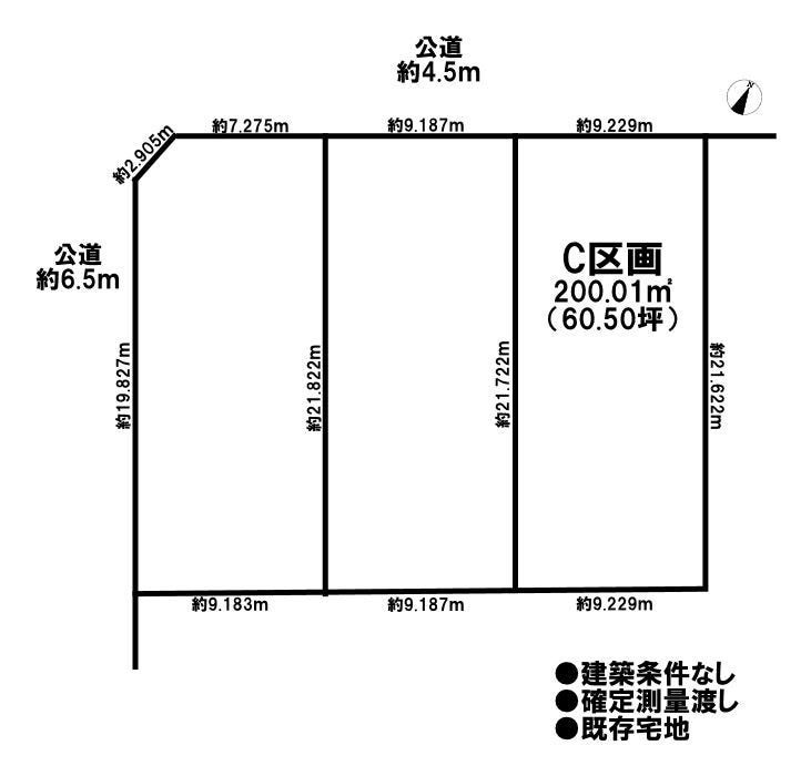 | 土地面積 | 実200.01㎡(60.50坪) | 接道 | 北側(公道)幅 約4.5m 間口 約9.22m |