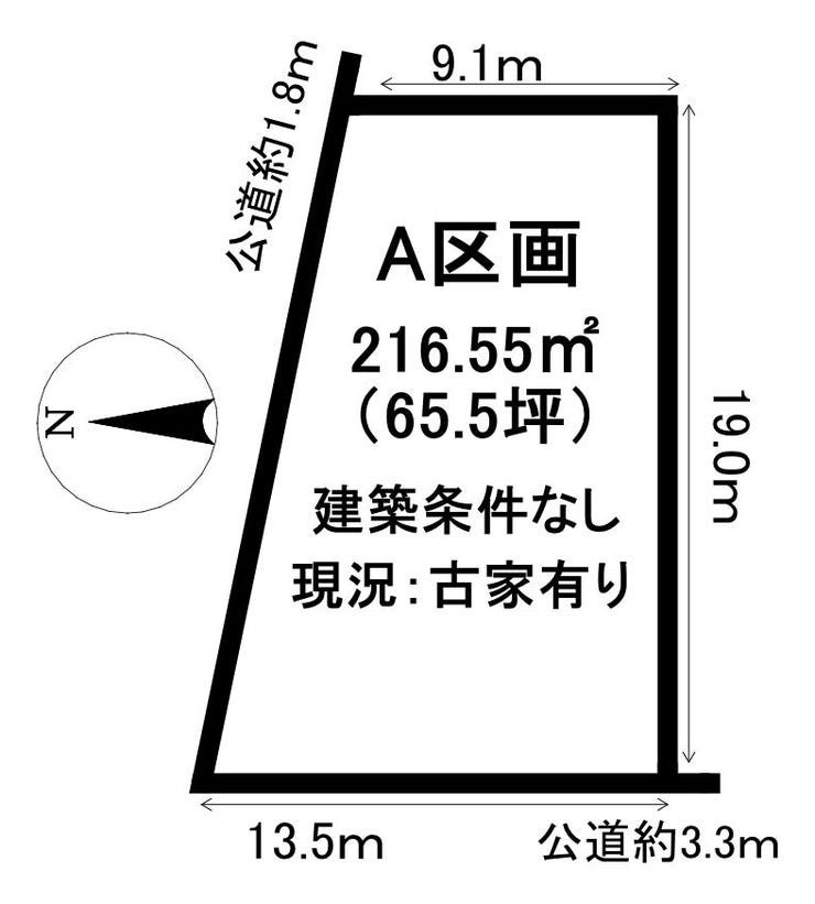 | 土地面積 | 実216.55㎡(65.50坪) | 接道 | 西側(公道)幅 約3.3m 間口 約13.50m 北側(公道)幅 約1.8m 間口 約19.60m |