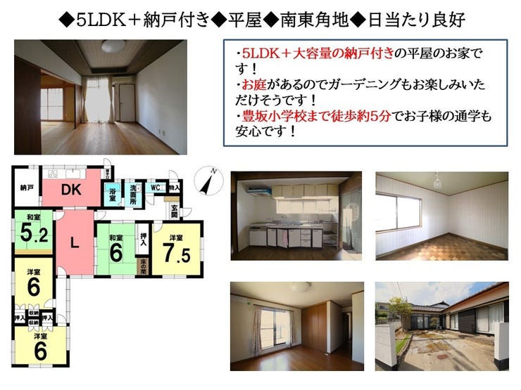 5LDK+Sの平屋のお家です!各居室が広々としており、ゆったりとくつろぐことができます。お庭がございますのでガーデニングや家庭菜園がお楽しみ頂けます♪豊坂小学校まで徒歩約5分でお子様の通学も安心です!