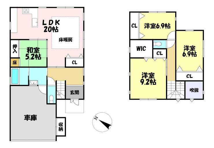 | 備考 | ・売り主の契約不適合責任免責 ・車庫スペース(普通自動車1台、軽1台)*車種、大きさによる ・1階床面積92.67㎡には車庫部分25.65㎡が含まれます。 |